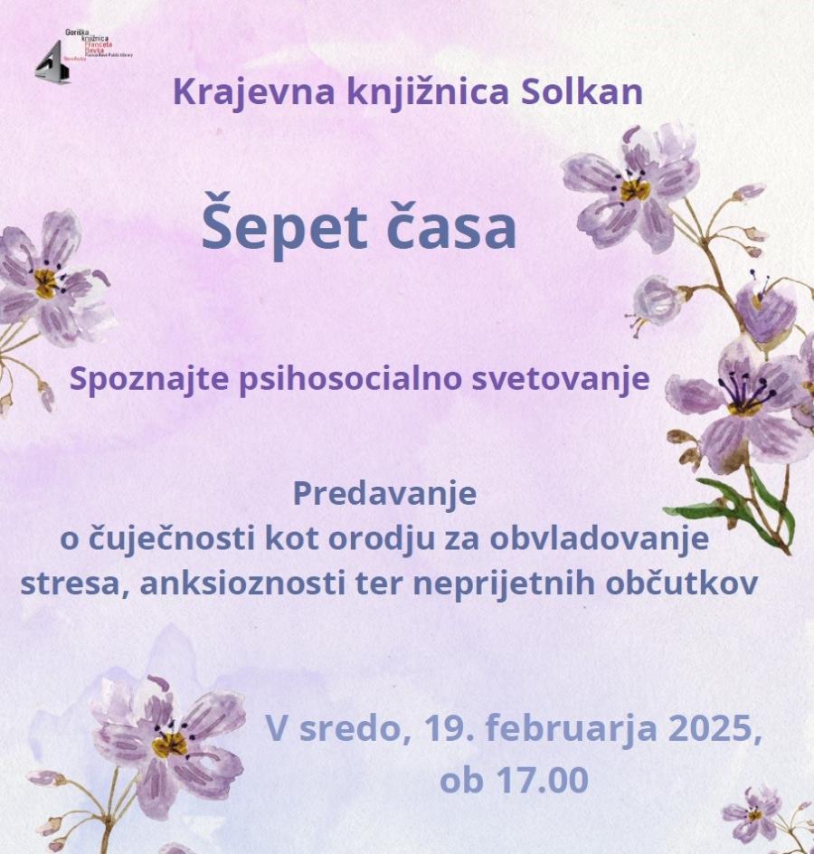 V sredo, 19. februarja 2025, ob 17. uri lepo vabljeni v Krajevno knjižnico Solkan. Prisluhnili bomo predavanju o čuječnosti kot orodju za obvladovanje stresa, anksioznosti ter neprijetnih občutkov ter spoznali psihosocialno svetovanje. Predavala bo Majda Blažič.