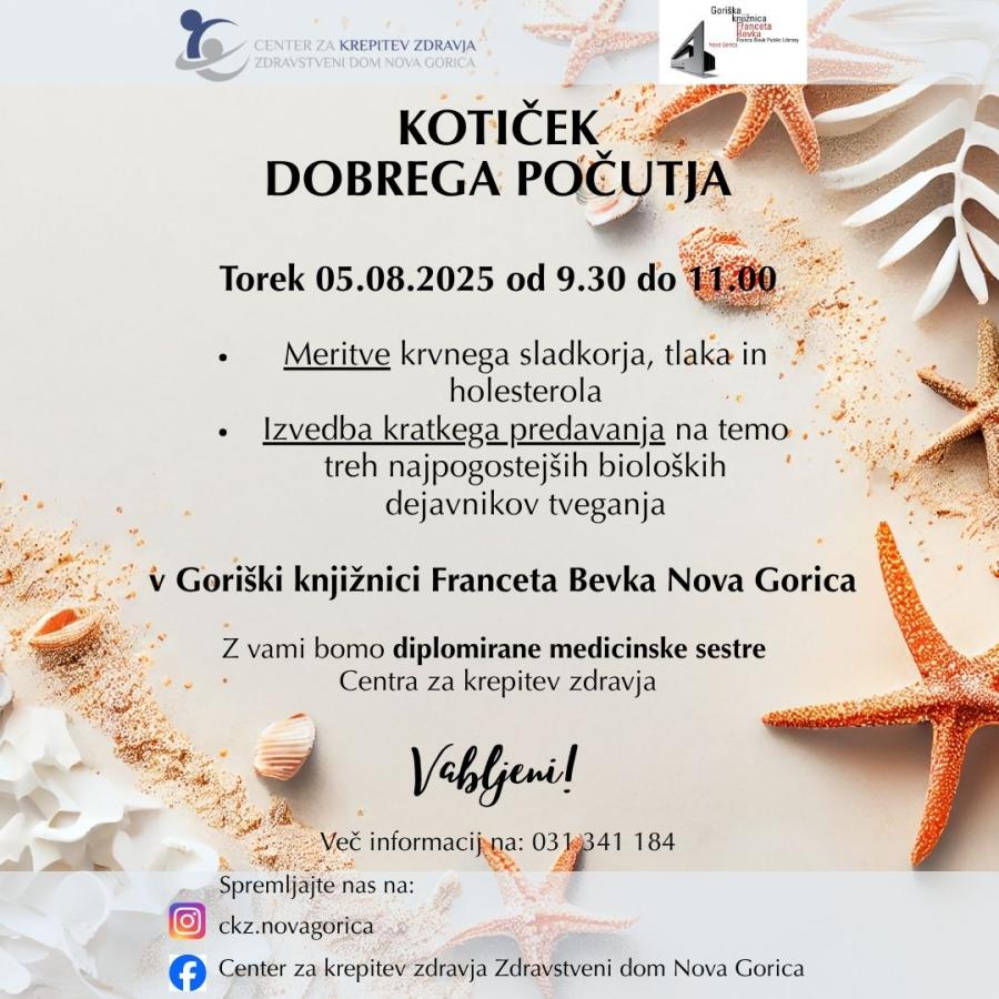 V torek, 5. avgusta 2025, od 9.30 do 11.00 bodo potekale meritve krvnega sladkorja, holesterola in krvnega tlaka, ki jih bodo izvajale jih bodo diplomirane medicinske sestre Centra za krepitev zdravja Nova Gorica.