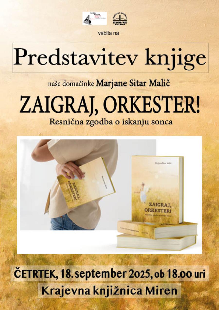 V četrtek, 18. septembra 2025, ob 18. uri lepo vabljeni v Krajevno knjižnico Miren na predstavitev avtobiografskega romana Marjane Sitar Malič: Zaigraj, orkester! Resnična zgodba o iskanju sonca.