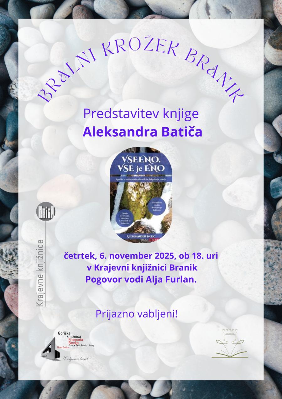 V četrtek, 6. novembra 2025, ob 18. uri lepo vabljeni na  srečanje Bralnega krožka Branik. Gostili bomo Aleksandra Batiča, ki bo predstavil svojo knjigo Vseeno, vse je eno. Pogovor bo vodila Alja Furlan.
