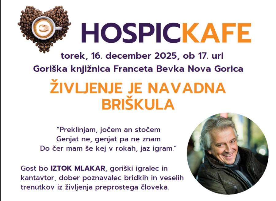 V torek, 16. decembra 2025, ob 17. uri lepo vabljeni na srečanje Hospickafe. Gost bo Iztok Mlakar, goriški igralec in kantavtor, dober poznavalec bridkih in veselih trenutkov iz življenja preprostega človeka.