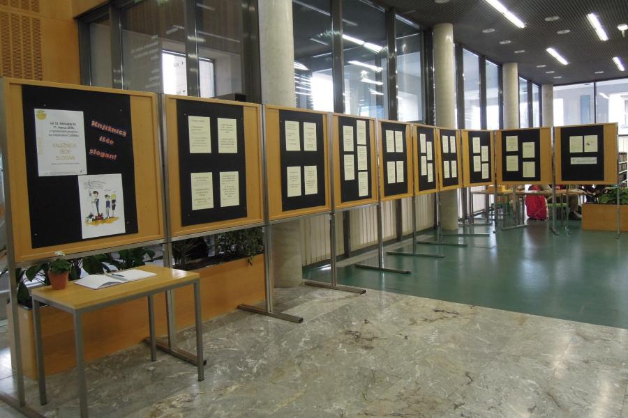 Na mladinskem oddelku je na ogled razstava vseh sloganov, ki smo jih prejeli na natečaj Knjižnica išče slogan. Spomnimo: potekal je od 2. 11. do 20. 12. 2015, prejeli smo kar 78 predlogov. Komisija je izbrala predlog ge. Aneje Gregorič: V objemu besed. Slogan že predstavlja našo knjižnico.