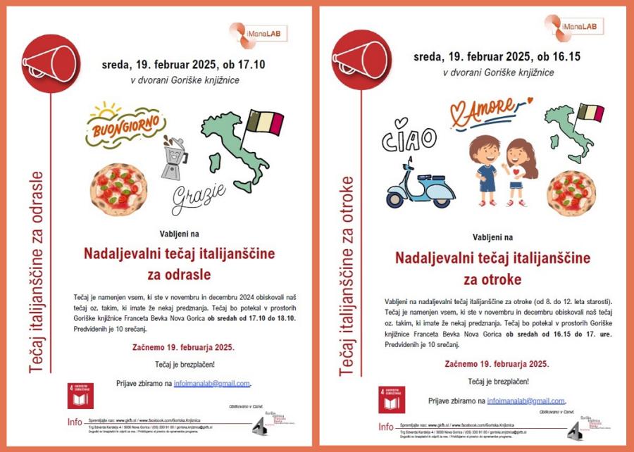 Lepo vabljeni na nadaljevalni tečaj italijanskega jezika za odrasle in otroke (od 8. do 12. leta starosti).Tečaj je namenjen vsem, ki ste v novembru in decembru obiskovali naš tečaj oz. takim, ki imate že nekaj predznanja.