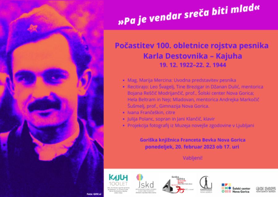 V ponedeljek, 20. februarja 2023, ob 17. uri lepo vabljeni na prireditev v počastitev 100. obletnice rojstva pesnika Karla Destovnika – Kajuha »Pa je vendar sreča biti mlad«.