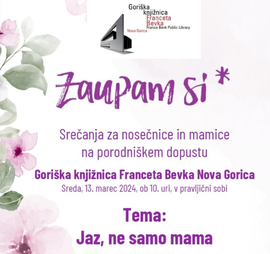 V sredo, 13. marca 2024, ob 10. uri vabljene na srečanje za nosečnice in mamice na porodniškem dopustu. Tema srečanja je Jaz, ne samo mama. Dogodek prireja skupina Zaupam si, Festival dojiva se v sodelovanju z Goriško knjižnico.