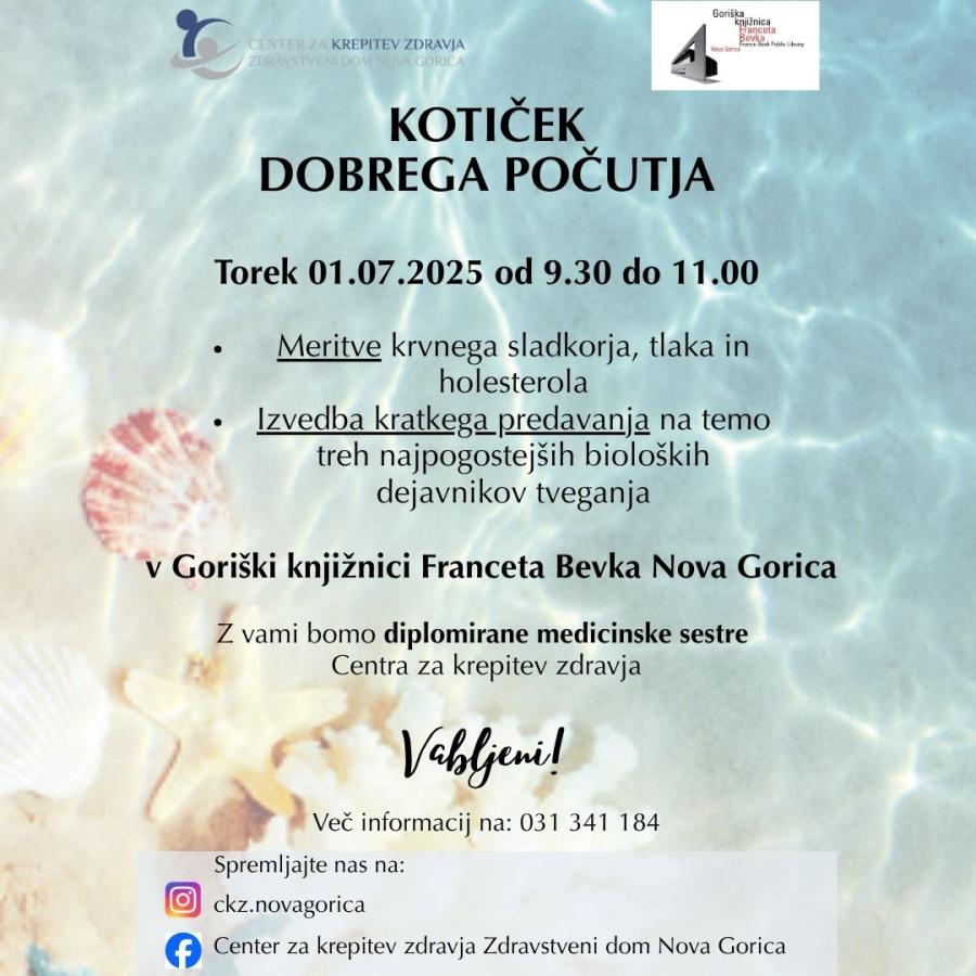 V torek, 1. julija 2025, od 9.30 do 11.00 bodo v knjižnici potekale meritve krvnega sladkorja, holesterola in krvnega tlaka, ki jih bodo izvajale jih bodo diplomirane medicinske sestre Centra za krepitev zdravja Nova Gorica.