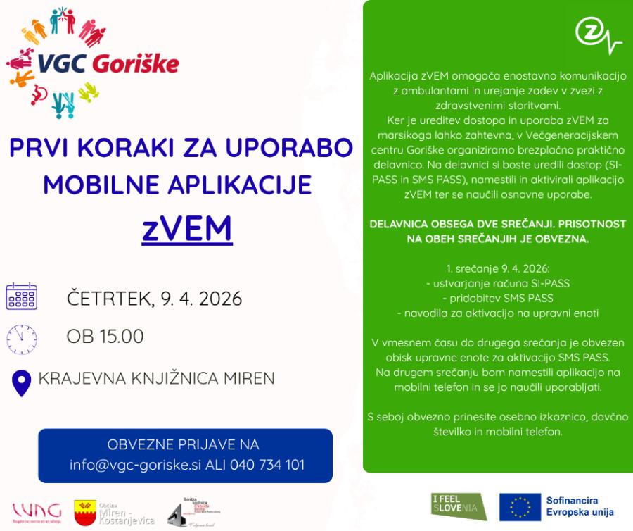 V četrtek, 9. aprila 2026, ob 15. uri lepo vabljeni na prvo srečanje o uporabi mobilne aplikacije zVEM. Srečanji bosta dve, prisotnost na obeh je obvezna. Na prvem srečanju bomo spoznali SI-PASS, na drugem pa namestili aplikacijo.
