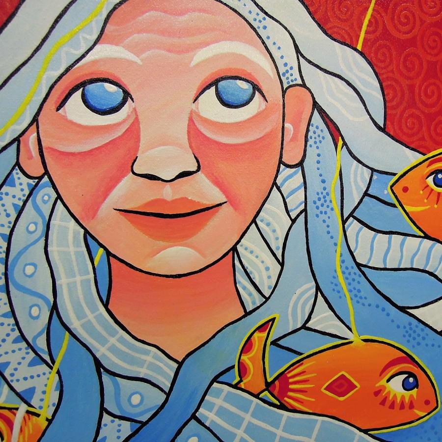 Fotografija: detajl slike na razstavi, Laura Ličer: Starka in morje. Besedilo povzeto po spletni strani avtorice.